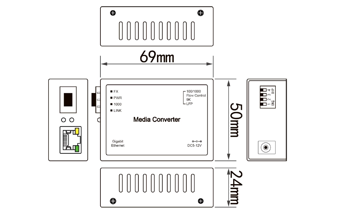 - Supports manual switching between 10M, 100M, 1000M or adaptive mode on the electrical port.